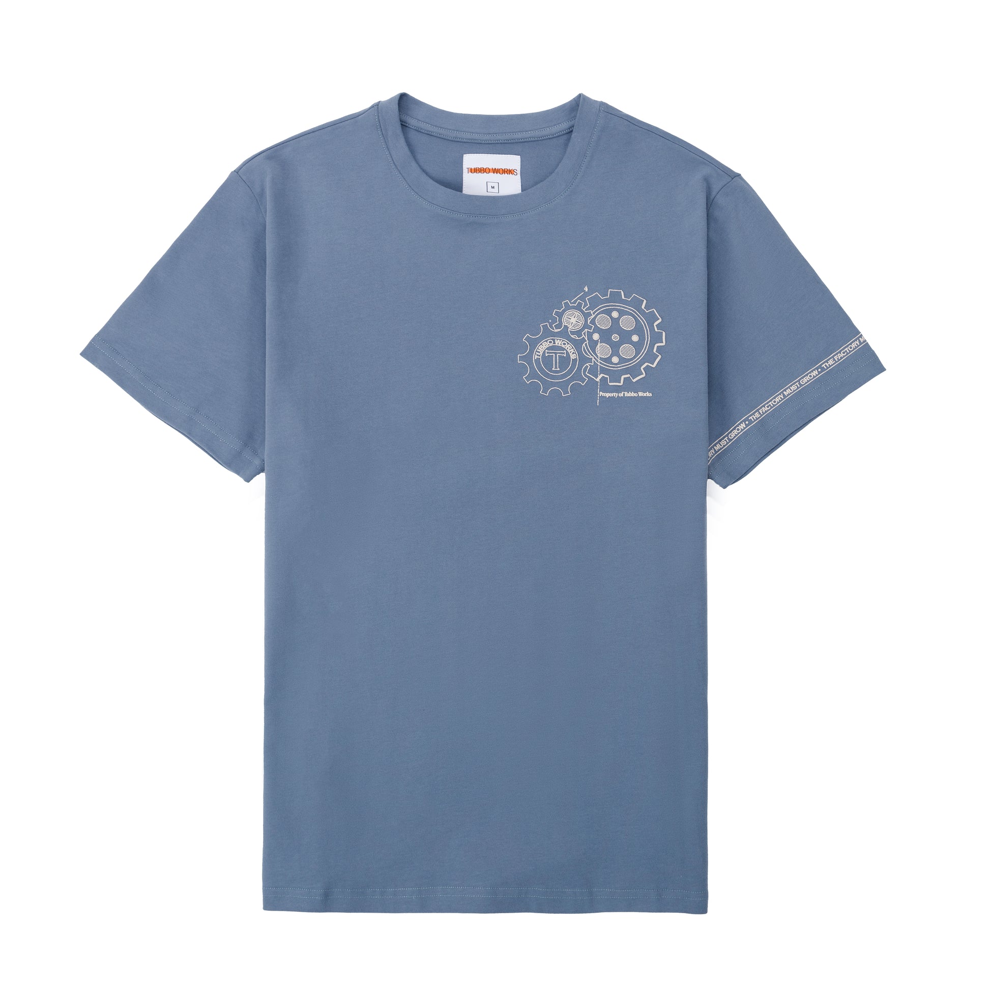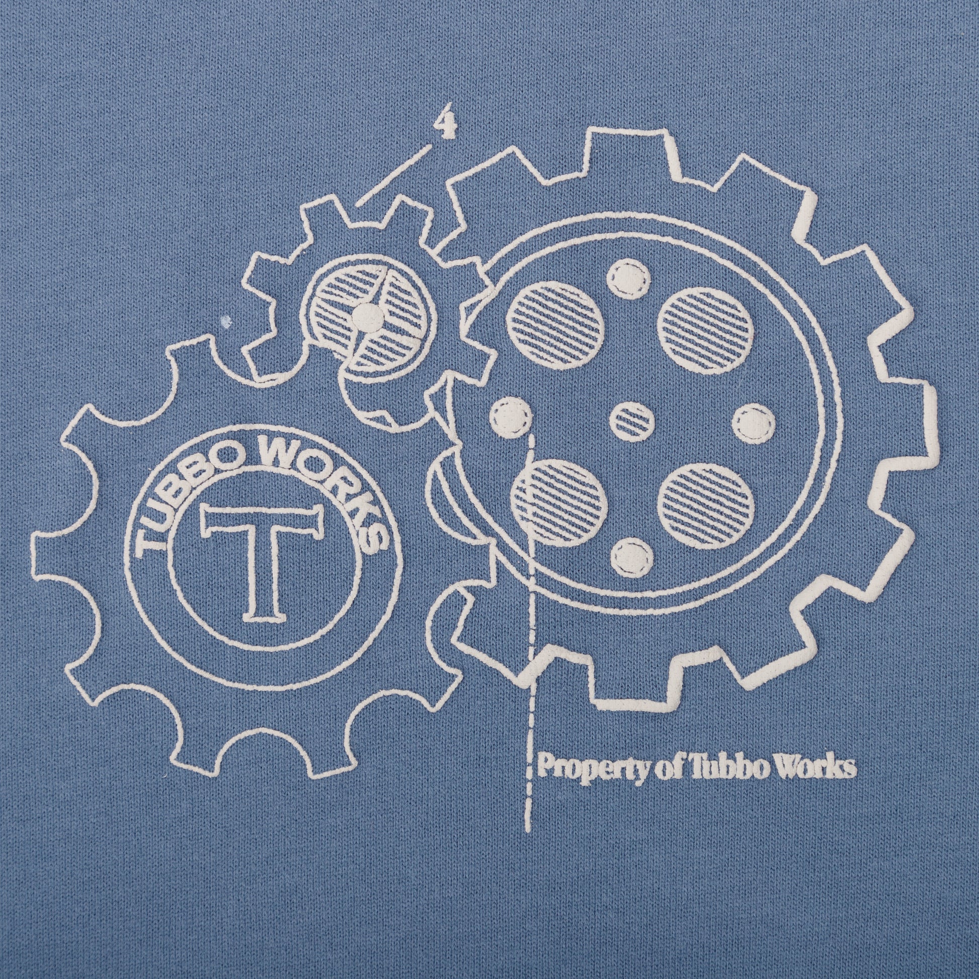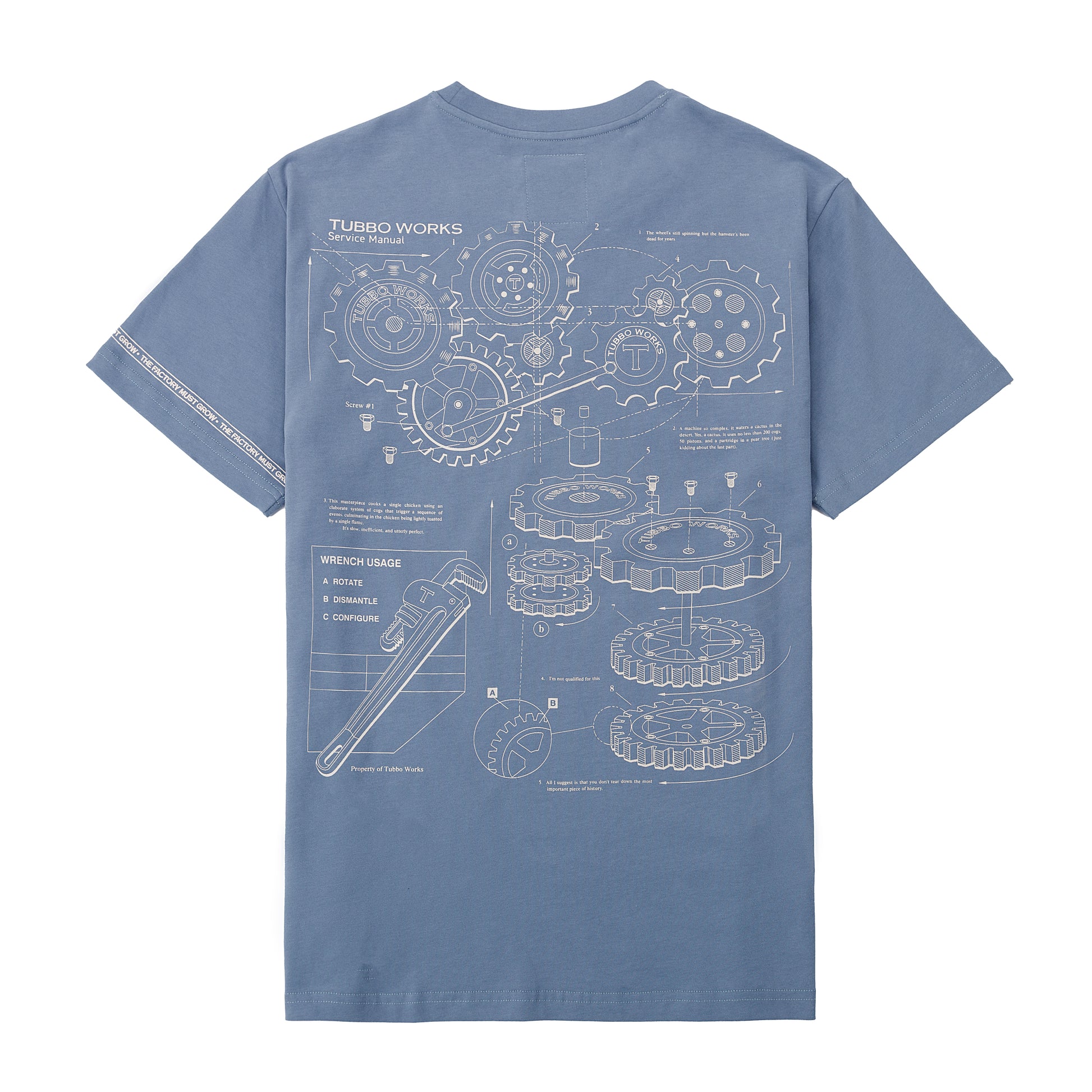 Soft blue t-shirt featuring puff print on left chest and left sleeve, and oversized Tubbo Works Service Manual graphic screen print on back.
