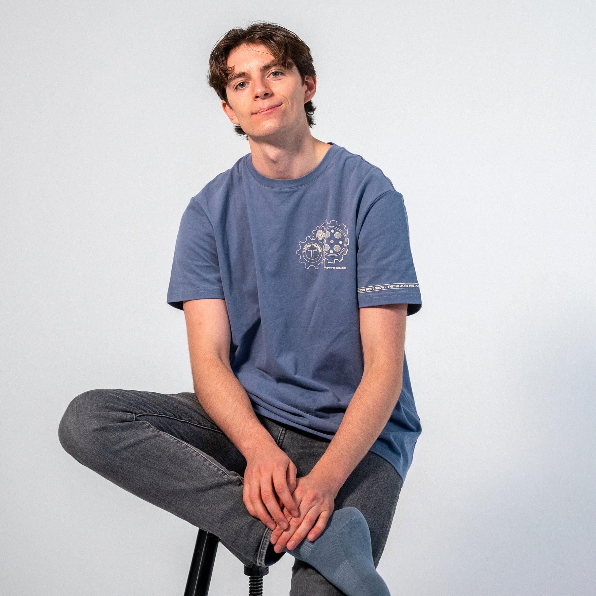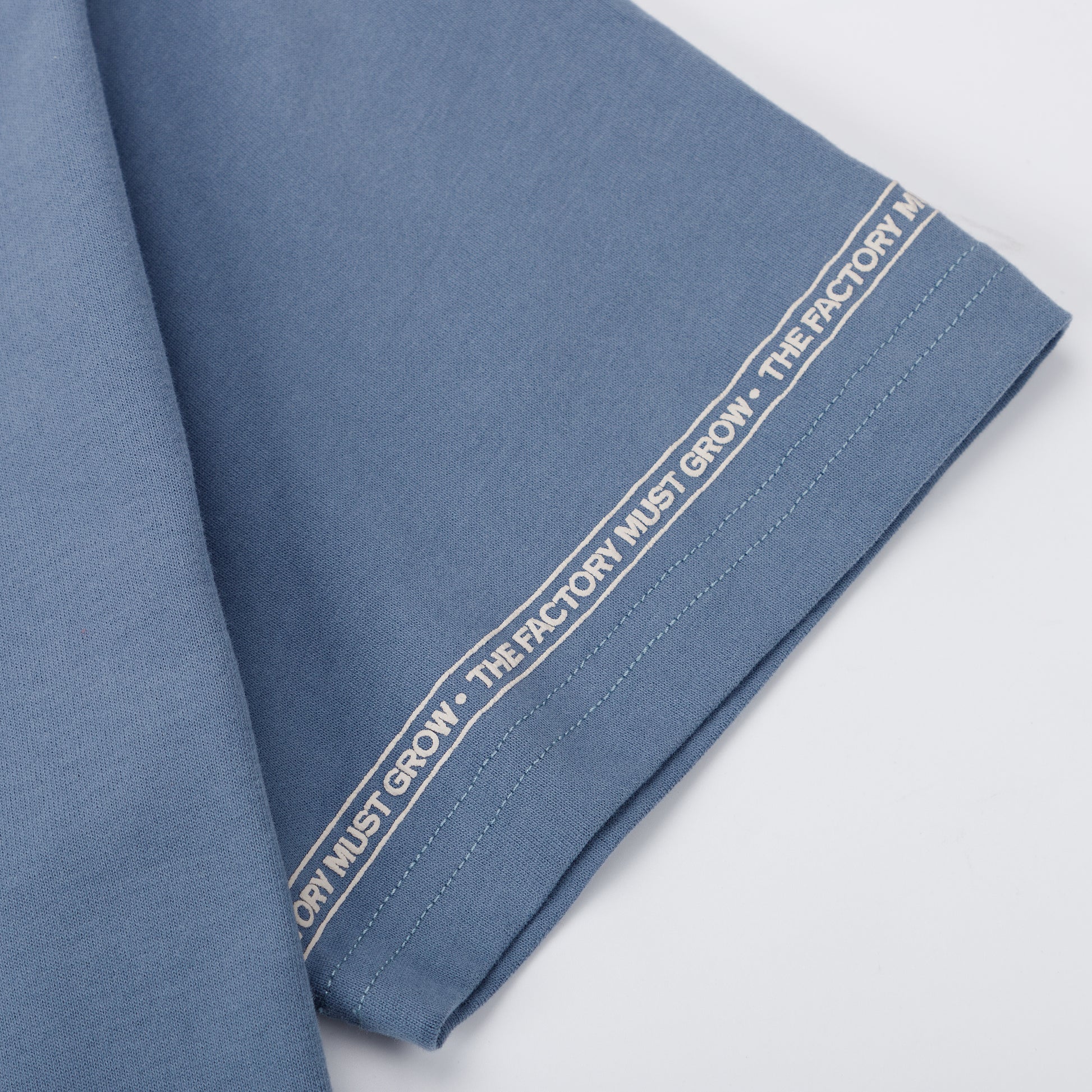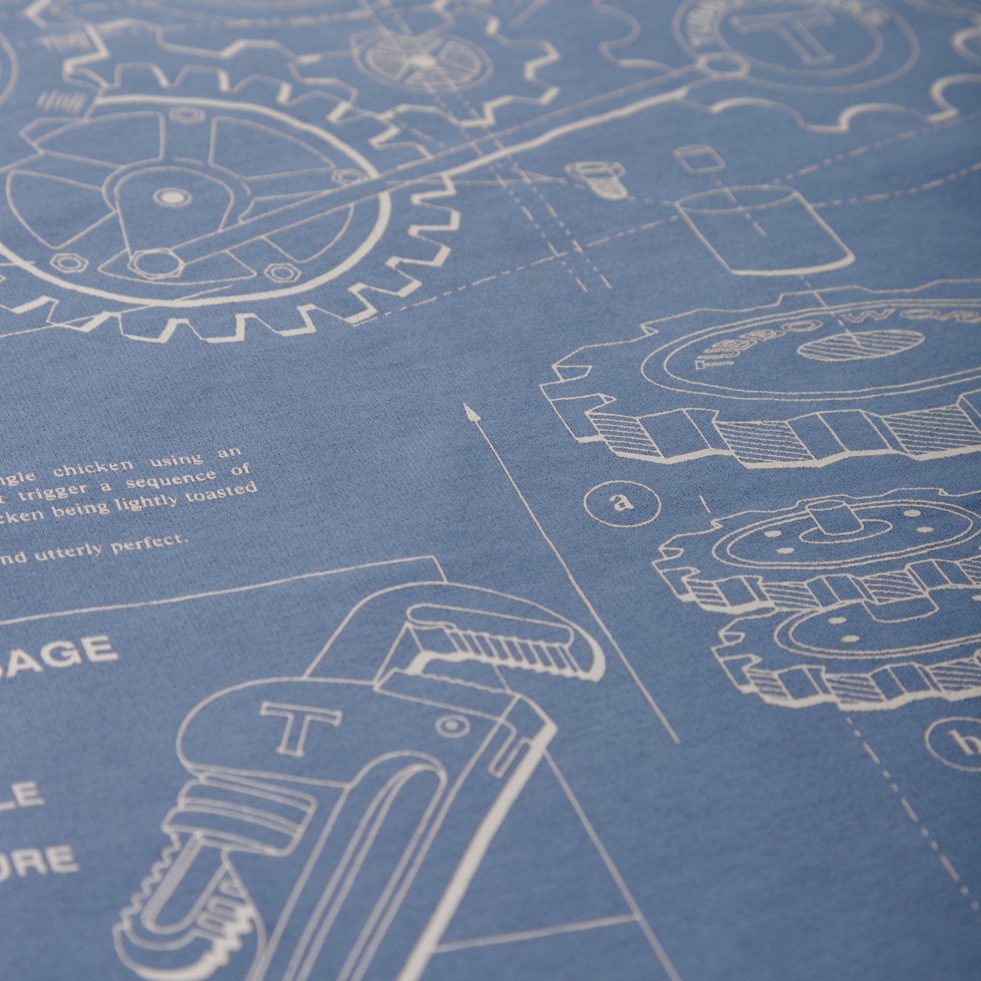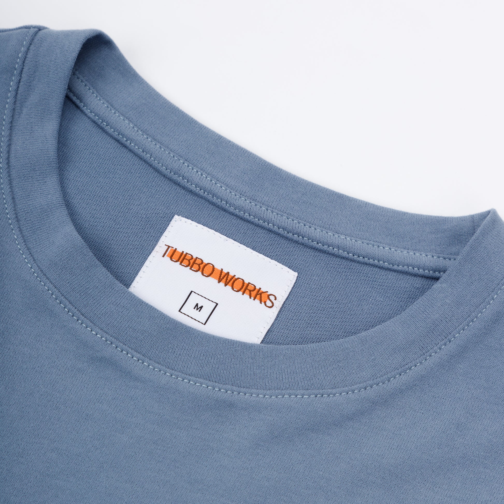 Soft blue t-shirt featuring puff print on left chest and left sleeve, and oversized Tubbo Works Service Manual graphic screen print on back.